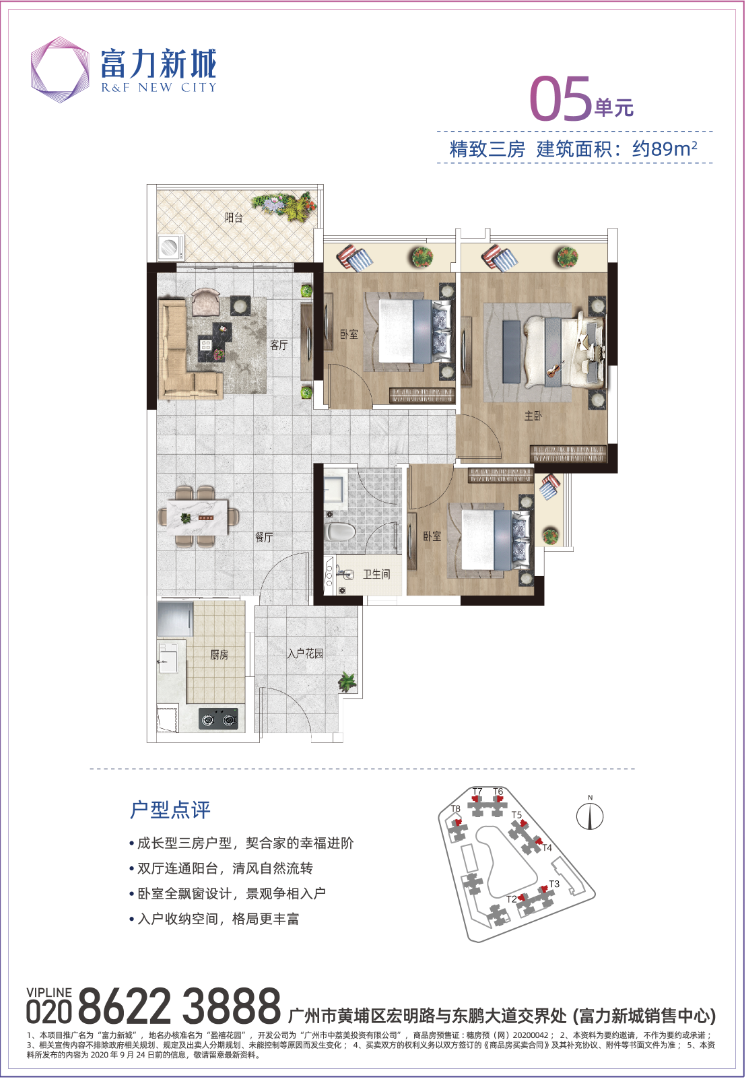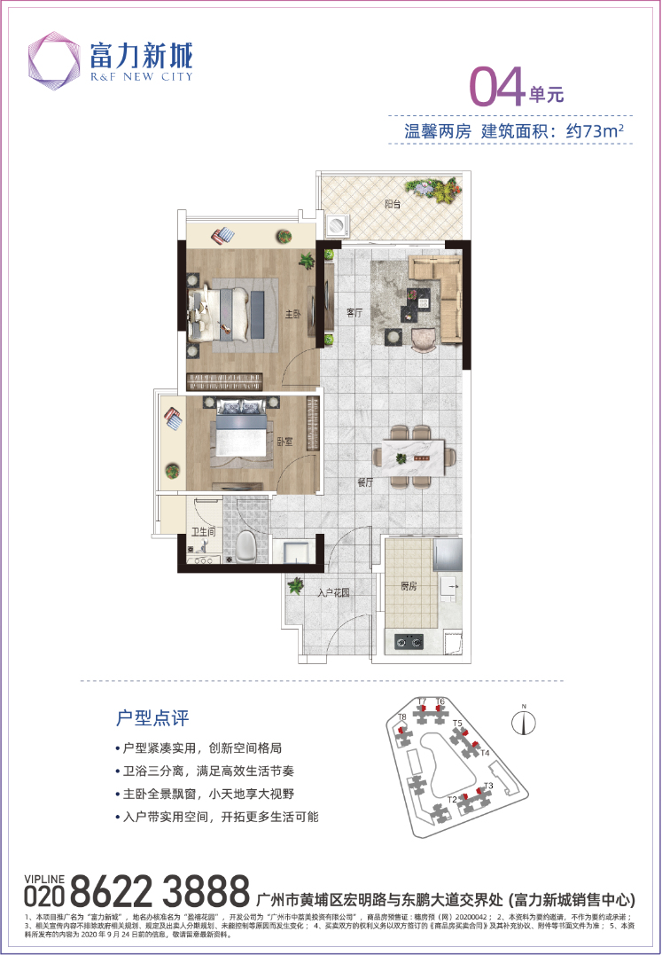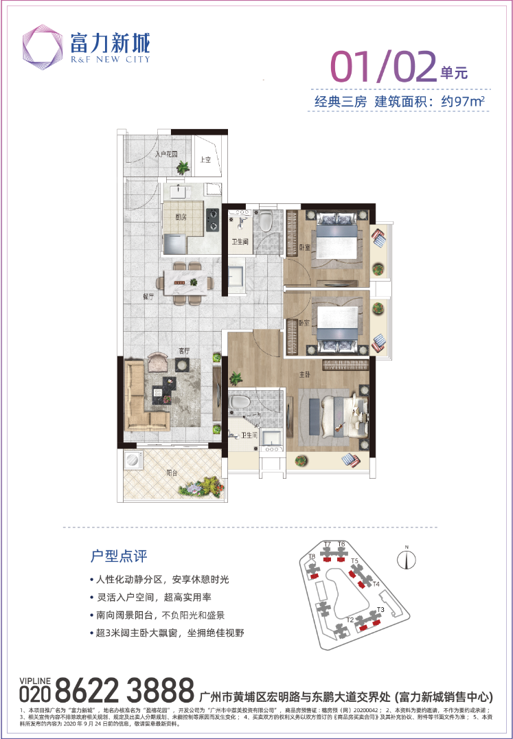 富力新城为富力集团打造的东进标杆项目之一,以180万方的大体量稳踞广州东C位热盘。得天独厚的优势地有轨电车2号线宏远路站,可接驳0米的丹水坑旅游风景区及龙头山森林公园,共同组成“广州东部绿肺”6000亩原生态古老森林公园,给你清新养护。大城内建8所学校,附近更享市一级东区小学、东区中学等,。项目周边两大商圈环绕,且自带22万方大体量商业(规划),配套完备,生活氛围醇熟。 01.【区位】富力新城地处临港经济区(定位全球创新港)与科学城板块的核心交汇处,所在区位于黄埔大道与广园快速之间“黄金发展线”,既占据城市发展趋势的价值红利,也配享城市配套落地的完善生活圈。 “3+2+1”的便捷出行方式 ◇ 30min畅达天河珠江新城核心CBD 2条地铁:笔村公交总站无缝衔接13号线及6号线,直达萝岗香雪,多条路线通往天河、萝岗和新塘 1条有轨:紧邻有轨电车2号线宏远路站 02.【产品】T2、T3栋约73-120平二至四房,准现楼发售(2023年6月交付) 带智能化交标,方正实用,满足大小家庭不同需求,且靠山望园,户户带入户花园,飘窗入景。 新品央景楼栋优势——南向望山景,北向望园林;楼距超128米,视野开阔无遮挡;楼栋更近小区入口和社区幼儿园,出行更方便;楼下即为多重业态的商业,享受一站式吃喝玩乐购。 教育优势:家门口目送孩子的上学方式 幼儿园:4所幼儿园自建,其中2所已建成(位于一期二期各一所); 中小学阶段:九年一贯制学校:广东外语外贸大学附属黄埔实验学校已开学(小学36班+初中18班),外有东区小学、初中配套等。 12年全龄段无忧教育助力孩子成长。 商业配套: 5min即达3大商超的休闲方式 ◇ 3大综合体:5min即达南岗万达、时代城、黄埔佳纷天地 22万方商业;项目自身规划约8万方商业中心+主题风情商业街等,约22万方商业配套,相当于1.5倍天河城体量。 医疗配套:4+1医疗护航的健康模式 4家医疗机构:暨南大学附属暨华医院(东侧)+三甲南方医科大学附属第三医院(西侧)+黄埔区红十字会医院(南侧)+省电力局医院 1家在建医院:广州市医科大学附属第十二人民医院已经正式动工,待穿山隧道修成之后,5min即可到达。