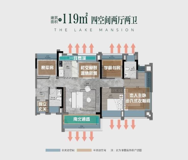 而压轴的119㎡户型,是白云湖板块唯一做到既能享受园景,更能享受湖景的大户型,此户型以【五开间朝南 + 南北对流】实现采光与通风的双重颠覆,是项目的进阶产品,首推即引爆板块市场,目前房源已经不多,真的卖一套少一套。