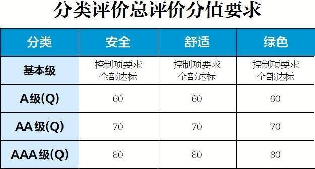 《征求意见稿》明确规定,安全、舒适、绿色、智慧的四类评价指标各设有多个分项指标,其中安全、舒适、绿色三类每个分项评价指标均包括控制性项、得分项。控制项评定结果为达标或不达标,得分项评定结果为具体分值。