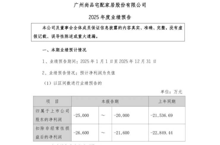 1月30日,尚品宅配发布2025年度业绩预告。公司预计全年归属于上市公司股东的净利润为-2.5亿元至-2.0亿元,扣除非经常性损益后的净利润为-2.6亿元至-2.16亿元,上年同期分别亏损2.15亿元、2.28亿元。