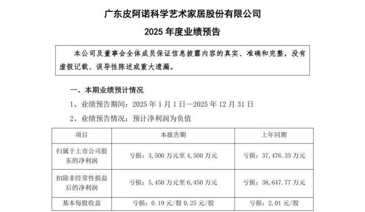 1月29日,广东皮阿诺科学艺术家居股份有限公司发布2025年度业绩预告,预计全年归属于上市公司股东的净利润亏损3,500万元至4,500万元,相较于上年同期3.75亿元的亏损,亏损幅度大幅收窄。