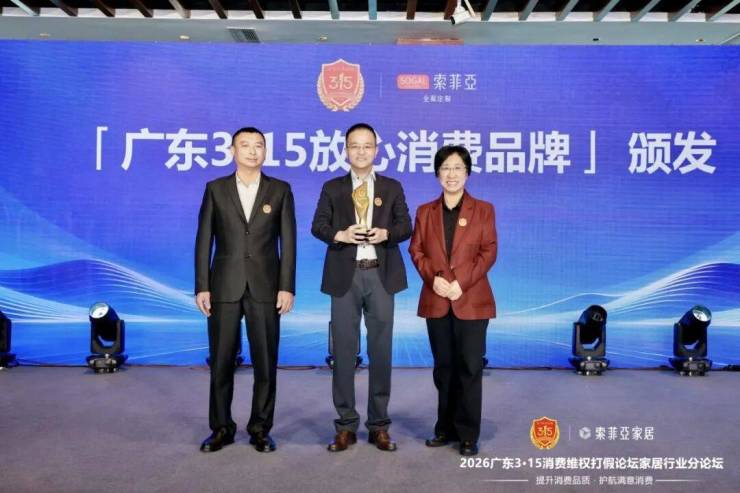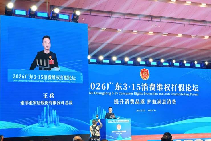 3月14日,2026广东3·15消费维权打假论坛在广州白云国际会议中心隆重举行,索菲亚家居受邀参与,并再度承办了广东3·15家居行业分论坛。索菲亚作为行业唯一代表,在此次论坛中同时荣获“3·15放心消费品牌”和“3·15 优质企业名录”以及“打假共建单位”,这是行业唯一的殊荣,也是索菲亚家居连续第二年荣膺这一系列认可。