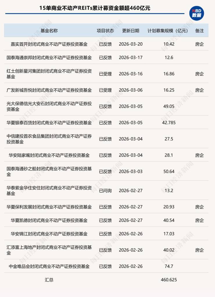 《每日经济新闻》记者梳理发现,截至2026年3月20日,试点开闸以来仅80天,沪深交易所已累计受理15单申报项目,计划募资总额超460亿元,已直逼2025年全年公募REITs发行总量(含扩募)。